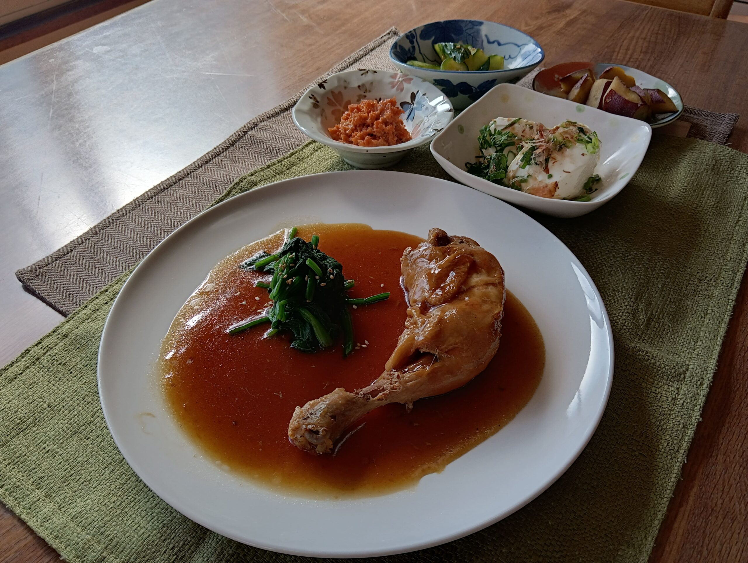 今日のメインは骨付き鶏もも肉の醤油煮込みです!