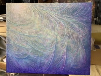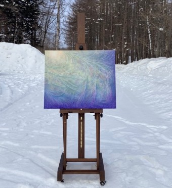 自分の絵が海外に呼ばれたのだったら、わざわざ自力で出来ない高額の海外出展の費用をかけることなど思いもせず、ただでさえ多忙なのに、さらに自分に追い打ちをかけるようにゼロからの調達に挑戦するなんて言う事は全く考えなかったです。お声がかかったのか氷紋アートだったから。もちろん、他の作品も褒めていただきましたが、皆様が共通して口にしてくださるのが、あの青い氷紋アートの美しさ、印象深さ、心に残ったと言う事だったので、これはもうオリンピック選手を海外に送り出すためにスポンサーがつくようなもので、この絵のポテンシャルを私の勝手で止めてはいけない、この方(絵)が行くべき運命を持っているならば、世に問うてみたらそれがわかるだろうと思い、クラウドファンディングに挑戦しました。そしておかげさまで沢山のご共感をいただき31%達成、クラウドファンディングページ以外からも、個別にサポートを申し出てくださる方々がいらっしゃり、超フライングで費用調達前に既にパリに飛んでいった2つの天恵の世界デビュー費用を賄えるまであと少し。新聞社さまの取材も、TVさまの取材も無事に終了し、新作の絵も期限までに完成でき、やっと再挑戦のクラウドファンディングページの申請まで漕ぎ着けました。