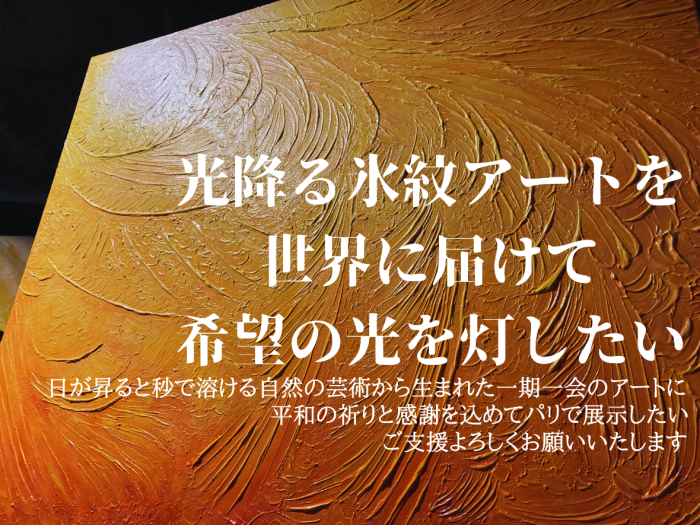 ぜひ明日7:30からおはよう北海道土曜+を見て、氷紋アートを知っていただきたいです。そしてこの美しい感動を繋ぐアートを、人々を再接続するような優しい共感が広がるアートをたくさんの方に届けるために、パリ出展の費用達成にはもう少し、秋のフィレンツェ出展費用達成のためには、まだまだたくさんの方にこの氷紋アートを知っていただいて、ご共感いただける方を募って行きたいです。大きなことに挑戦する事は誰でも1人ではできません。これは私個人の挑戦でもありますが、伊達大滝で生まれた北国の美しい氷紋アートと言う新しい自然芸術の挑戦でもあります。人には作り出せない神秘的な造形を見ると、暖かい日の光を浴びた時のように、感謝や感動が自然に心の奥底から生まれてきます。私はそれを届けたい。マスクをし、温かい温もりを分かち合うことができる人ならではの触れ合いも控えるようなこの時代だからこそ、恵みをありがとうございますと、心の奥底から温かい気持ちが湧き出るようなこの氷紋アートが生まれたのではないかと思います。ぜひ一度、氷紋アートに触れてみてください。