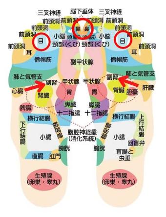 「目」「鼻」「副腎」の反射区の位置はおおよそ下の図の通りです。