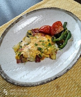 じゃがいも・ベーコン・豆苗のオムレツ風。