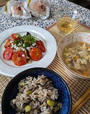 枝豆雑穀ご飯・具だくさんのサンラータン風・夏野菜のハーブソース・あんぱん❤はと麦茶