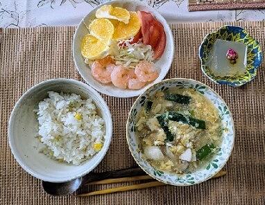 韮と手羽元の酸辣湯・エビサラダwithオレンジソース・塩エンドウとコーンご飯・梅寒天