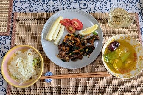 枝豆と陳皮の炊き込み飯・鱒のサフランスープなつめ入り・生姜漬け鶏レバーの炒め物・    ホワイトアスパラ・手作り梅ジュースの寒天クコの実入り