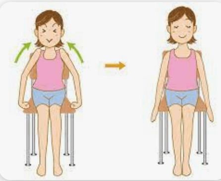 ① 両肩をグッと上げ、耳に近づけるようにして10秒間キープする
