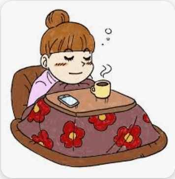 こたつに肩まですっぽり入り、