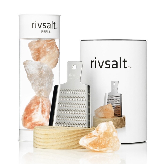 オーク材のデスクスタンドにシャープな光沢が美しいグレーターと、ヒマラヤ産の岩塩をセットし、そのまま食卓へ。