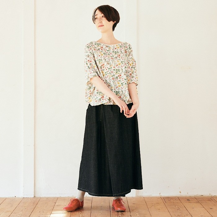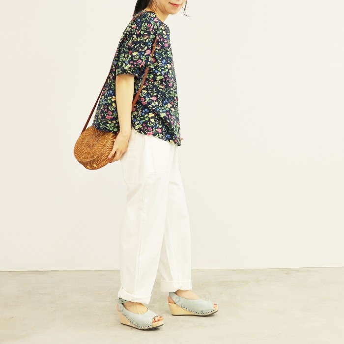 小花柄が夏らしくスリットも丸くかわいらしいドルマンスリーブのブラウス。