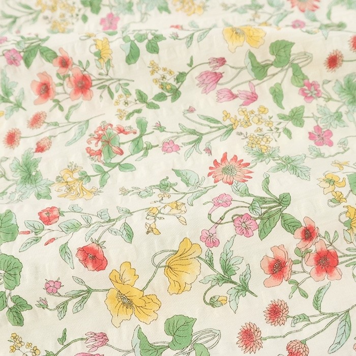 リップルローンというぽこぽことした汗染みしにくく肌離れの良い素材です。ふんわり風に揺れているような優しいタッチの小花柄がデザインされています。