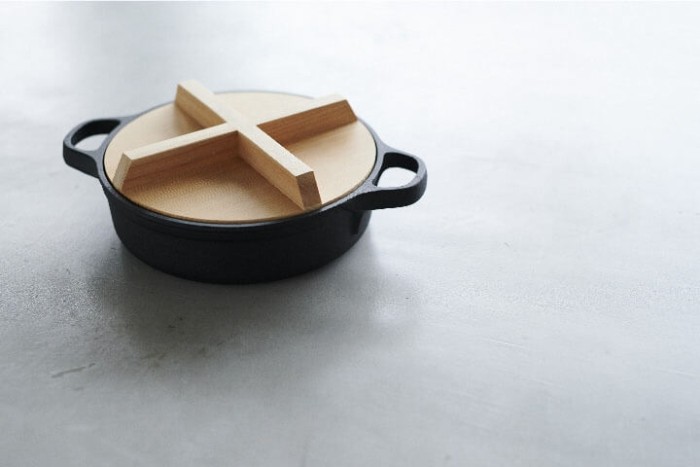 黒く締まった鉄のボディに天然サワラの木蓋をアレンジ。