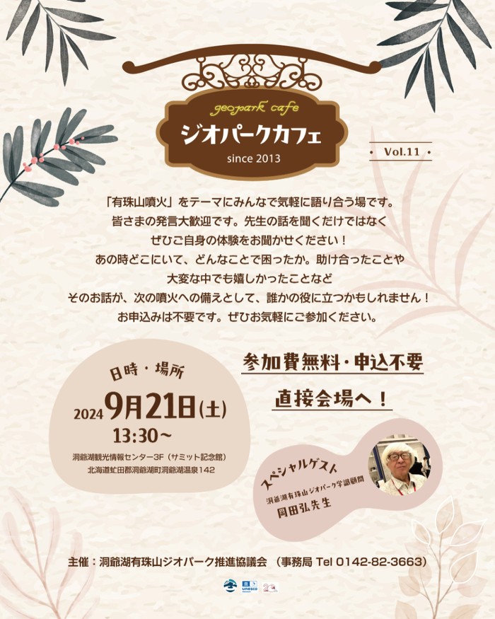 ジオパークカフェとは、ジオパークの楽しみ方や最近のトピックスなど、飲物片手にみんなで気軽に語り合う場です。スペシャルゲストとして岡田弘先生(北海道大学名誉教授)をお呼びしています。