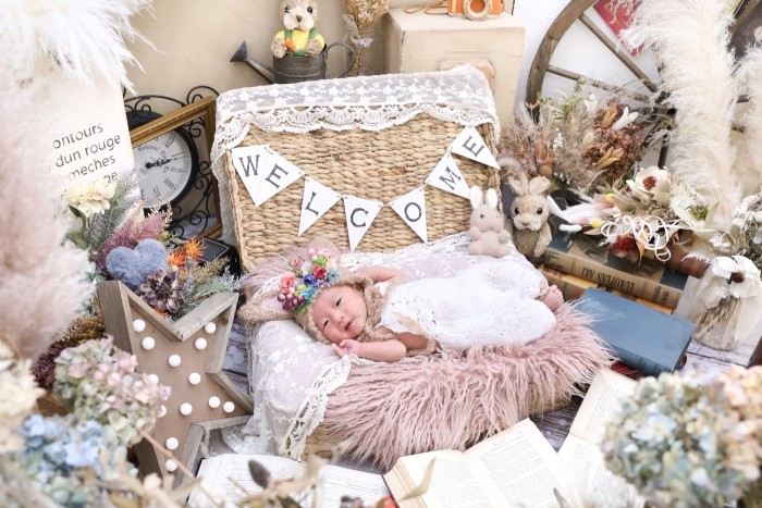 ニューボーンフォトは基本プランでご予約可能です。当スタジオは、基本的には1日1組様限定の完全プライベートスタジオとなっておりますので、基本プランでご予約をお取りいただいております。