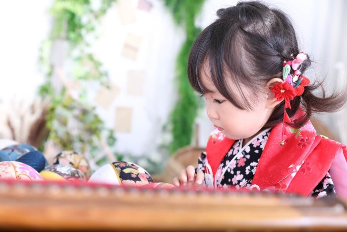 スタジオには鞠や風車・巨大な千歳飴袋など・・・撮影小物で遊びながらさつえいしていきます♪