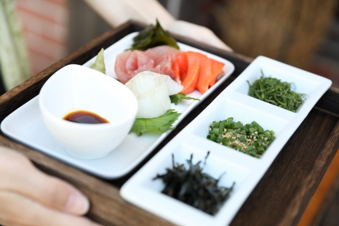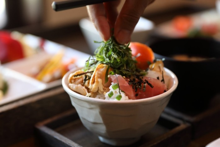 ご飯にホタテ、ごま、大葉、刻み海苔、ネギ、お好みでワサビをのせて...