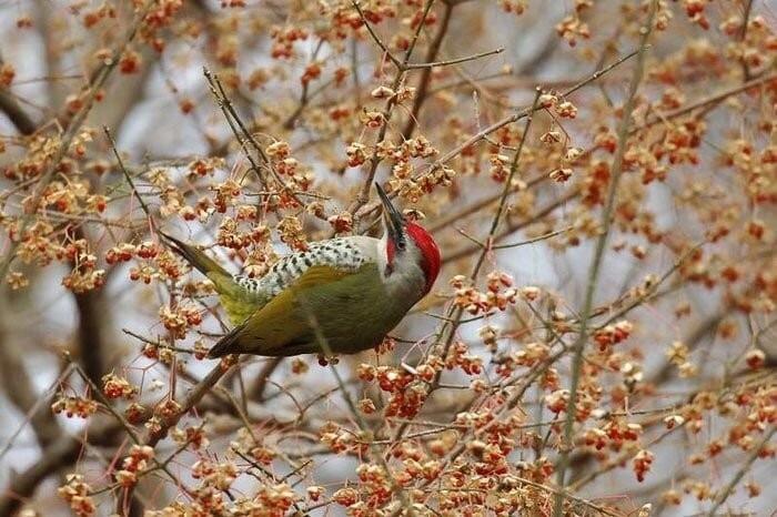 今朝も、キツツキさんは、カフェの入口の樹をコンコンコンコン・・・