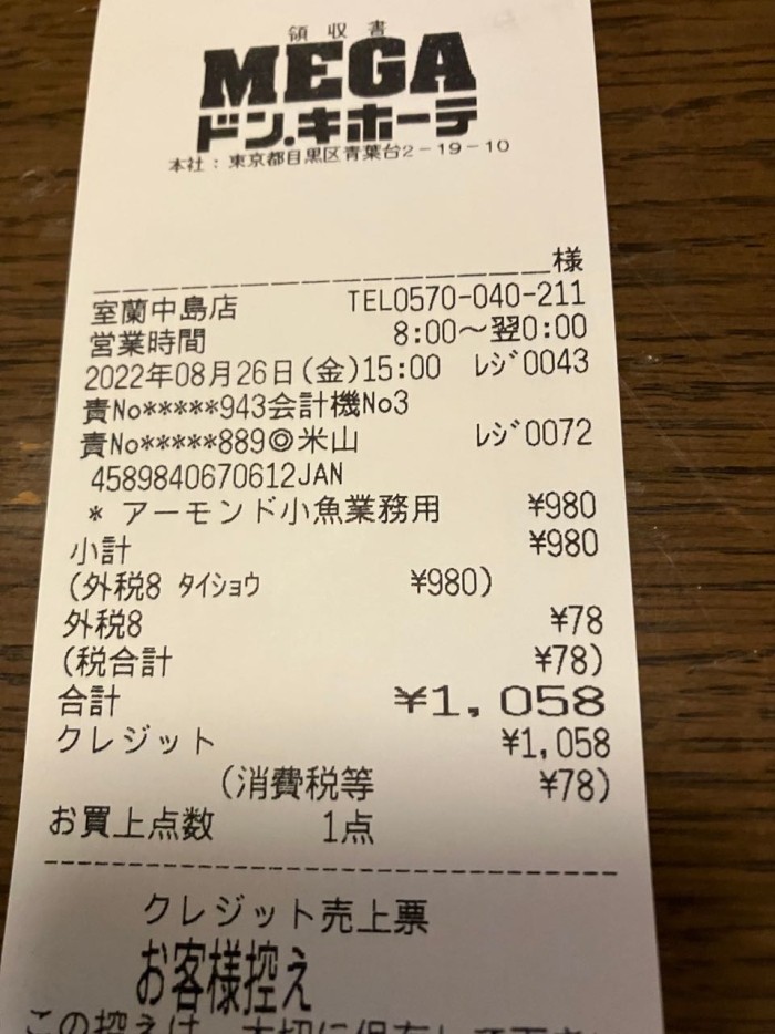 アーモンドフィッシュ(お徳用サイズ)を1つ買っただけのレシートなんです。