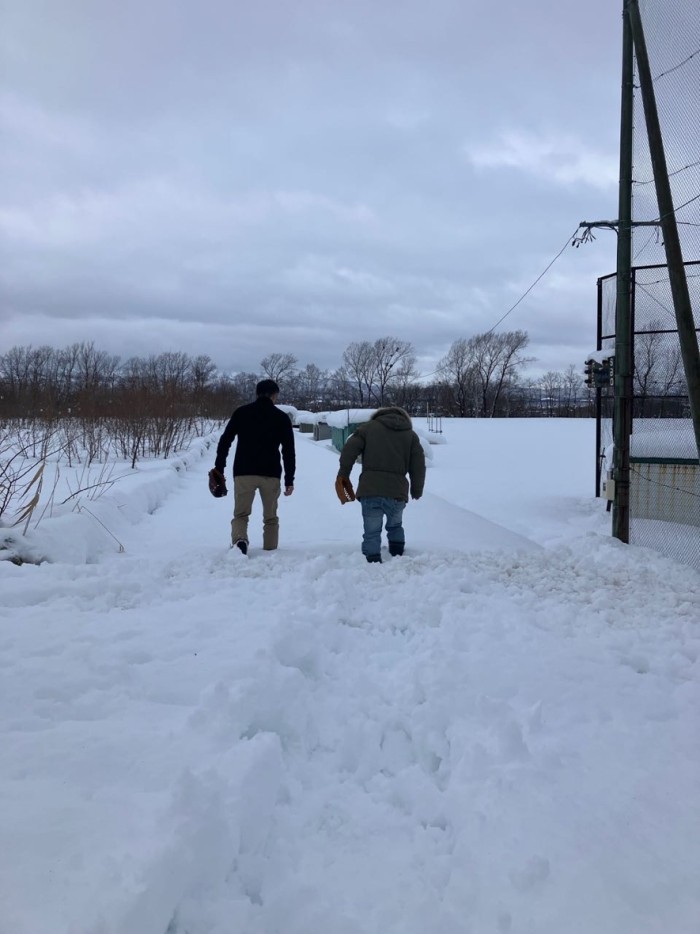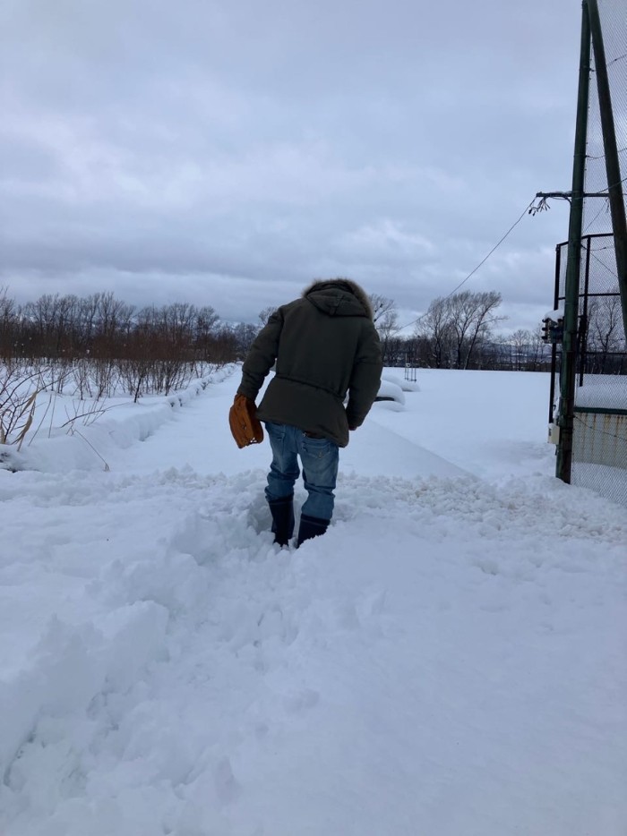 で、私は靴の中に雪が入るのがイヤなのでここにいてキャッチボールを始めたのです☆