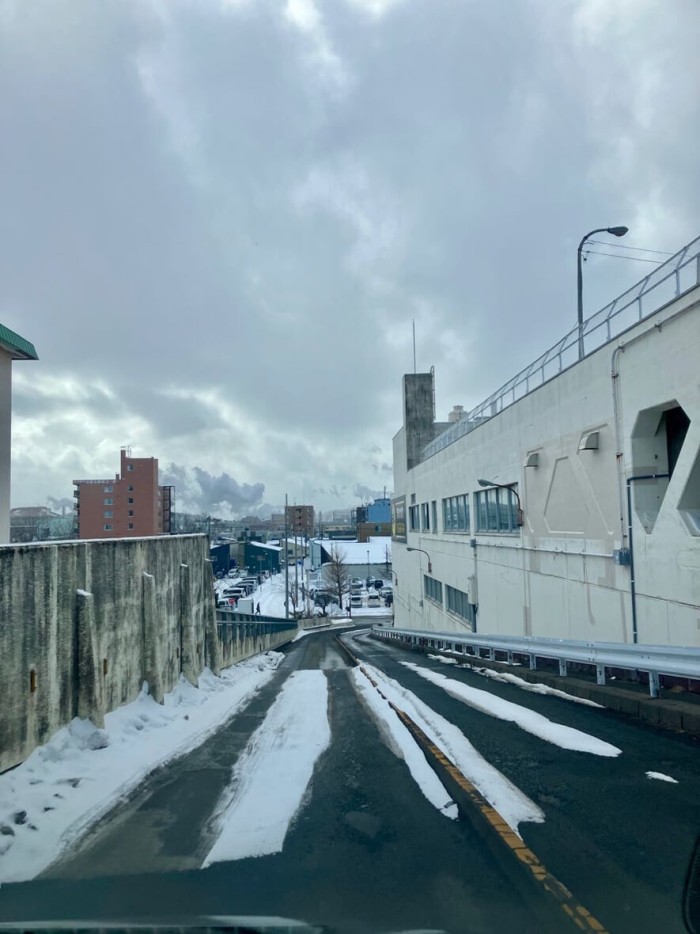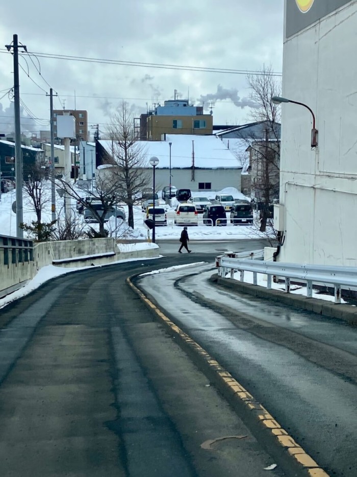 これは先日の休日の日に撮影した写真なのですが爆弾低気圧の日は降雪量がスゴかったのでこの急な坂道のロードヒーティングが追いついてなくて全部アイスバーンの状態だったのです!!!!