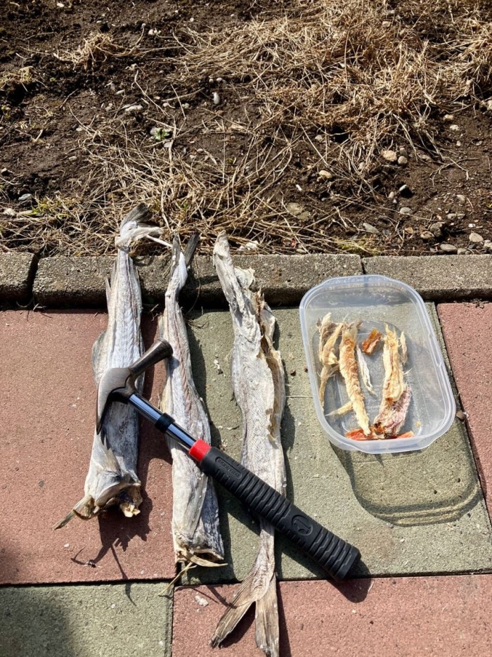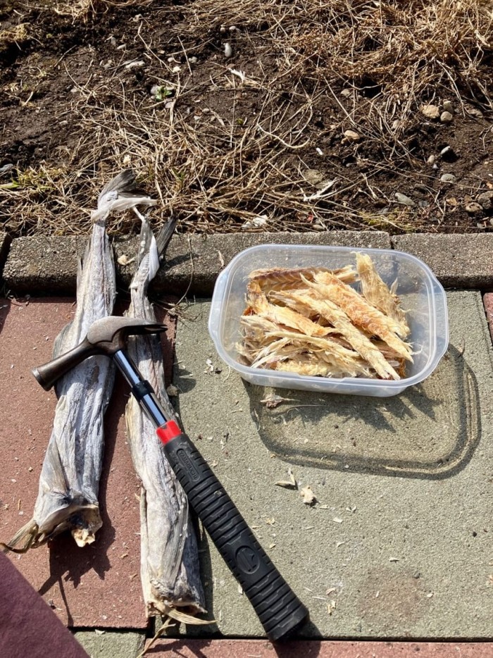 地元のゴッツい漁師の岩田さんにいただいていた棒ダラの干したやつの皮を剥く際にまずはトンカチでほぐすのでした。