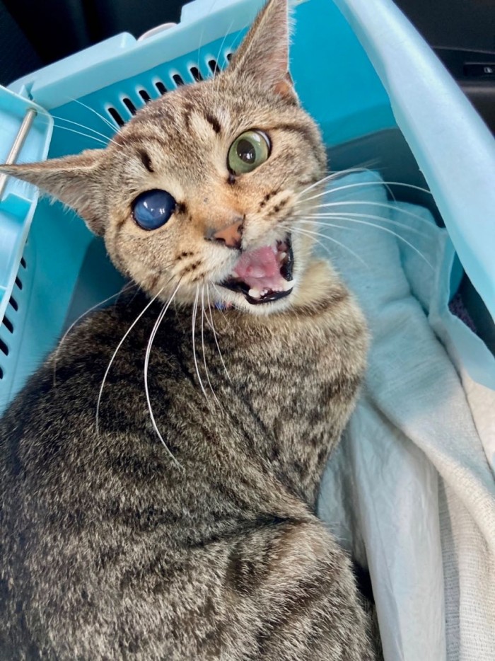 アゴの骨が折れていて事故の影響で目も充血しているネコちゃんなのです。