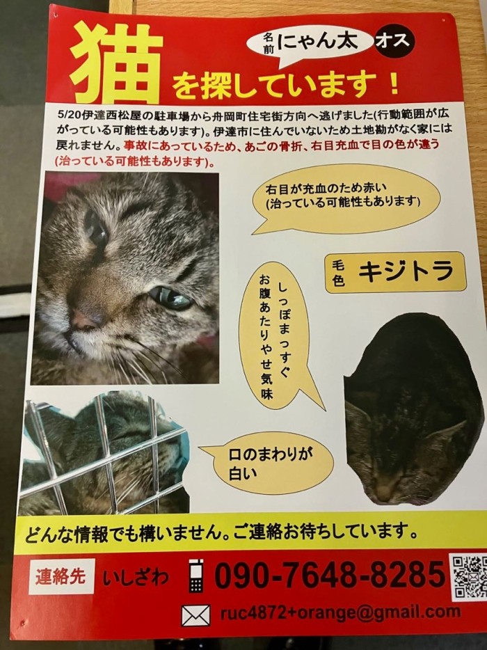 そんなネコちゃんを心優しい方が保護してあげていて伊達市にある動物病院に連れて行った時に駐車場で車から逃げてしてしまったとのコトなのです。