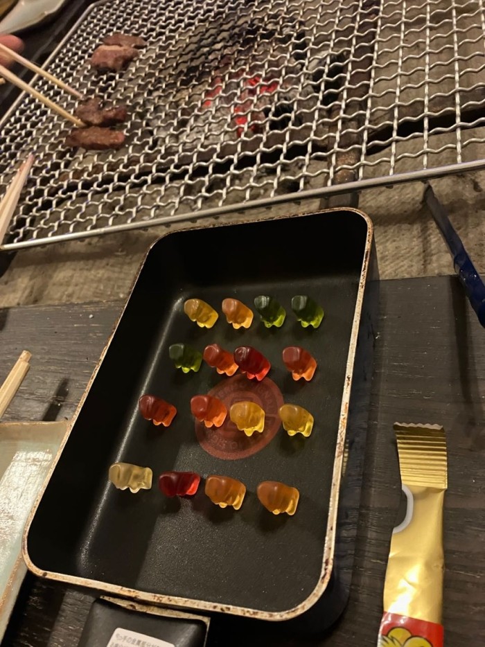 こんなにフライパンに並べたグミ(ハリボー)を今度は…