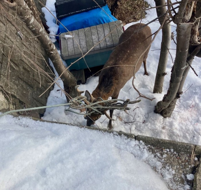 誰かが仕掛けた罠じゃなくてただただどこかにあったロープに角が引っかかって暴れているのです