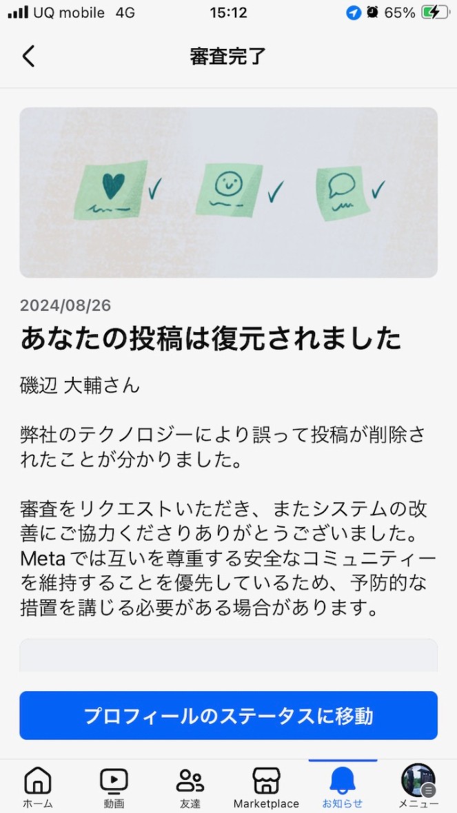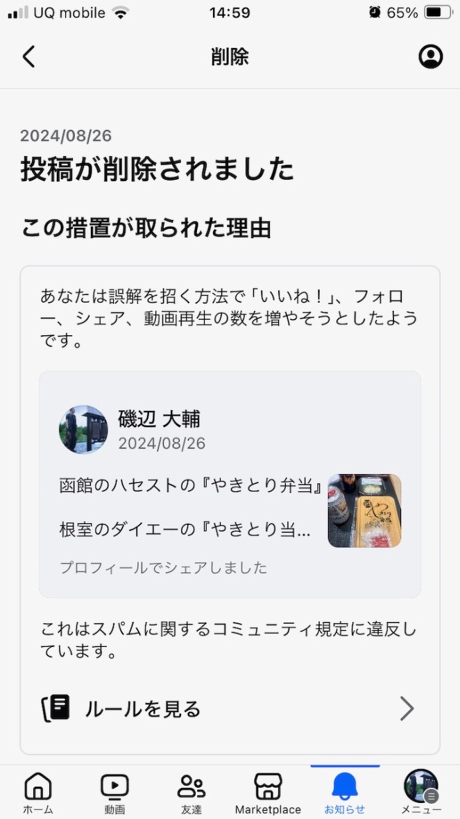 いきなり昨日のFacebookの投稿が『あなたの投稿が不適切と判断したので削除しました』と表記がされて投稿が削除されたのです!!!!!!!