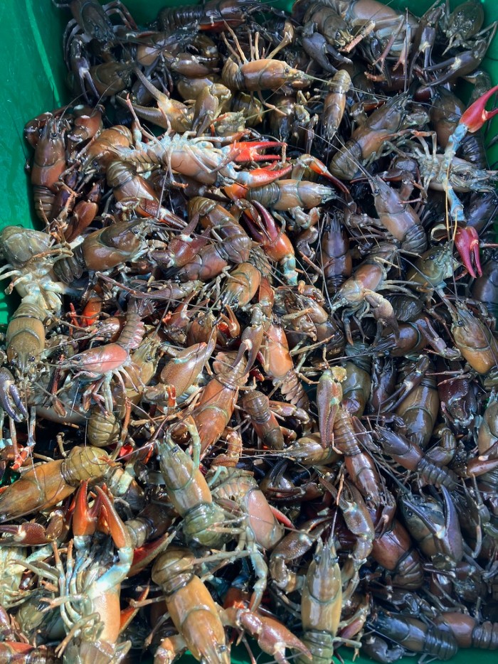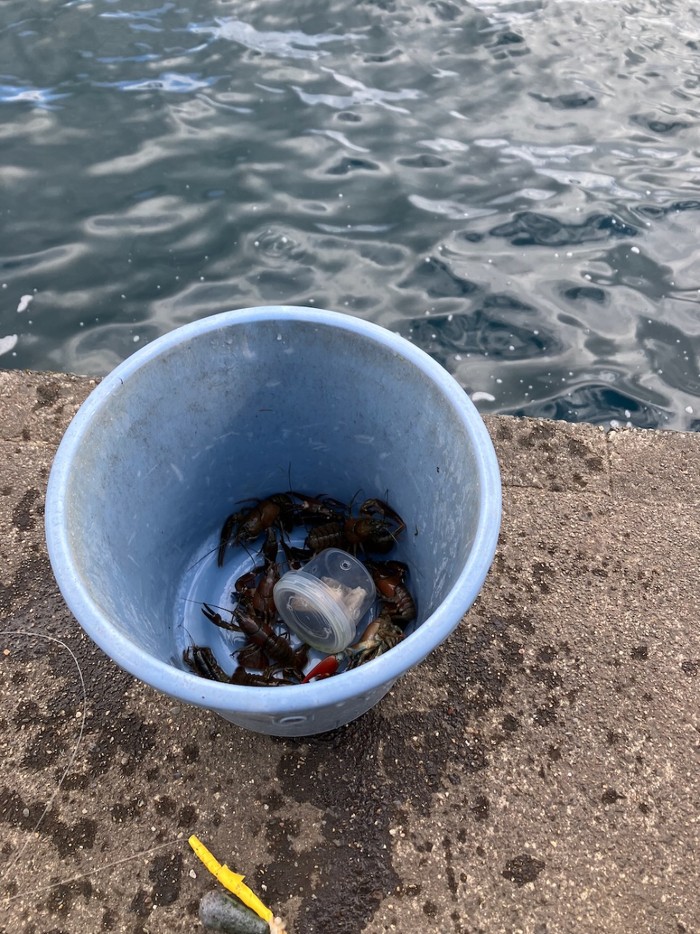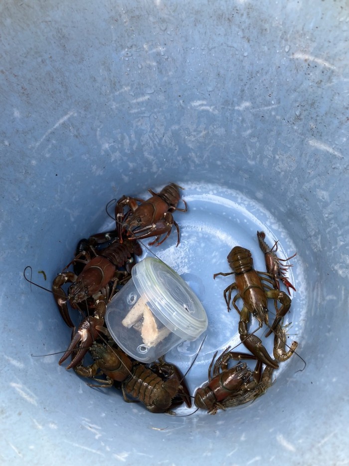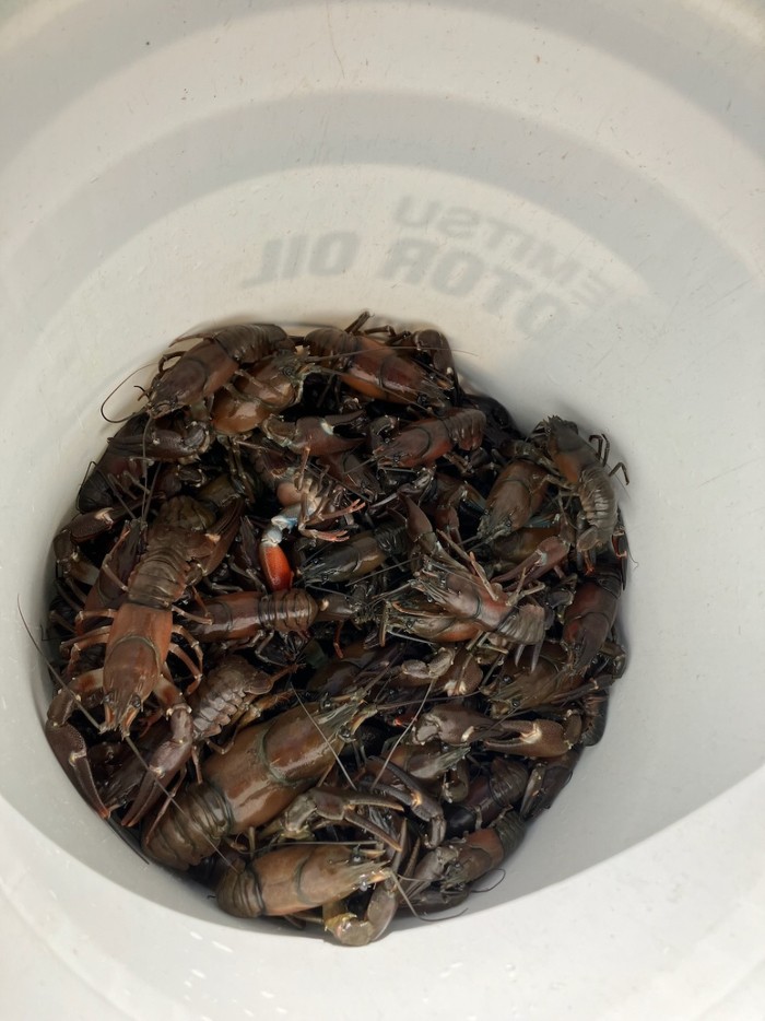 数十箇所にしかけているワナのうち、1つのカゴに入っているウチダザリガニはこんな感じでした