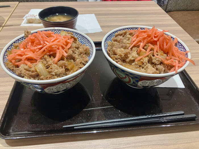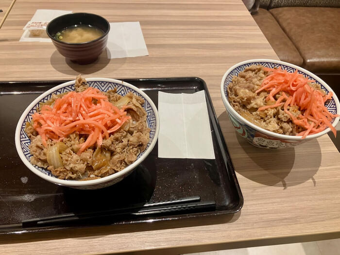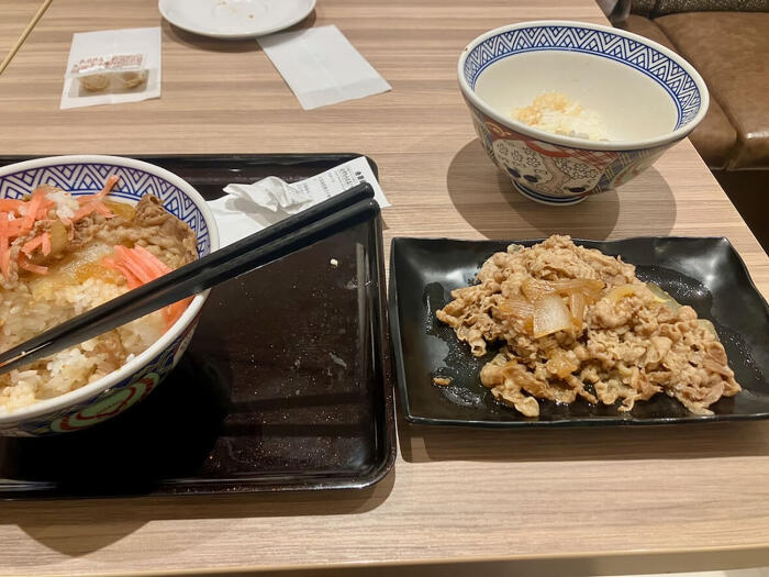 深夜の大盛り牛丼 2杯+追加の牛皿を食べてしまいました‥