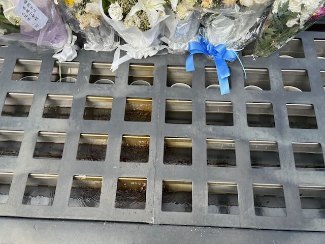 献花のお花のために水が流れていた献花台