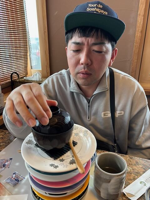 昨日の昼に環境省から凱旋帰国した葉っぱフミフミと「和さび」の回転寿司を食べに行ったのでした