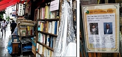 裏通りにもある古本屋。          本屋で見付けた新刊記念対談のポスター。