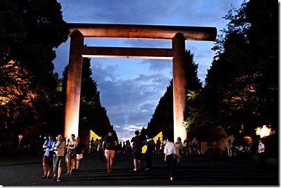 靖国神社の大鳥居。 外国人観光客が多いが「みたままつり」の意味を知って来ているのか?