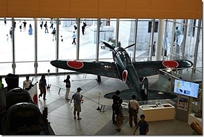 遊就館入り口に飾られている零式艦上戦闘機「ゼロ戦」。