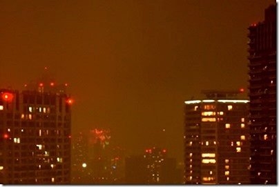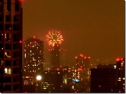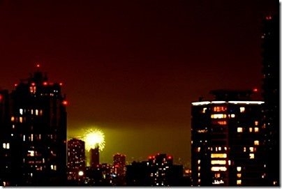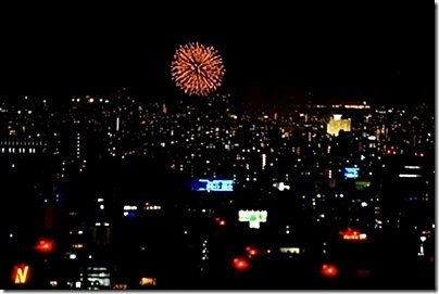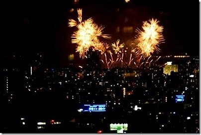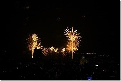 隅田川花火大会が始まったが、霞んでよく見えない。(中央左)