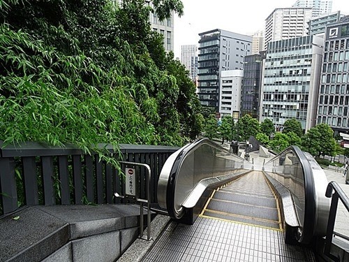 巨大な石造りの鳥居の前に立つと、中央に石段、そして左右にエスカレーターがある。
