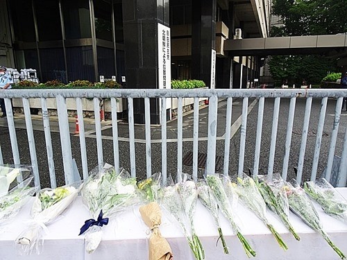 門は固く閉じられているが、その先の道路際に「献花台」があり花束が並んでいた。