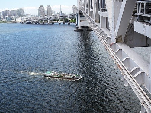 作業船がレインボーブリッジの下をくぐる。