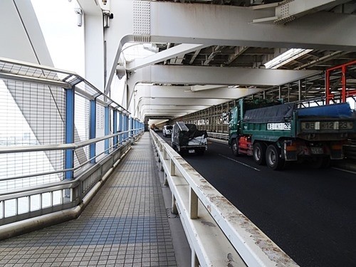 東京湾の上に架かる橋なので見晴らしは良いが、海風が吹いて来るので汗をかかない程度に涼しい。でも車の排ガスもまともに吹き付けて来る。頑丈なガードレールはあるが、それでも車が近くて怖い。