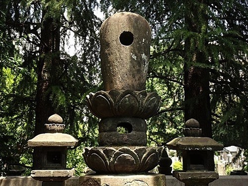 目に付くのは細長い丸形の墓石と台座に、丸い穴が開いているいることだ。
