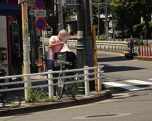銀髪の中年白人男性がいて体も大きく、俳優のような顔立ちである。自転車の後ろには「Ubereats」のバッグがあった。そしてスマホで地図を見ているところだった。