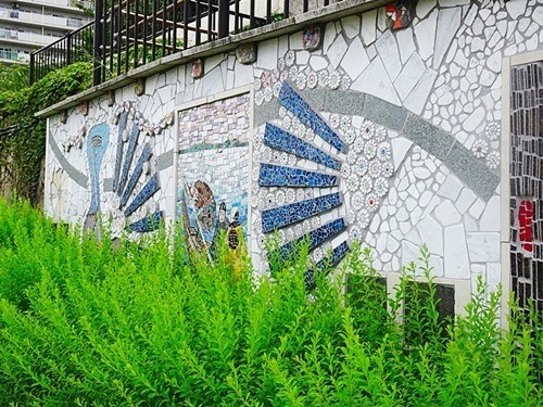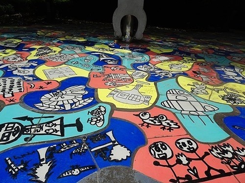 そこにあった説明書きを見たら、この場所は「パリ広場」という名前で、この派手なデザインは中央区で学ぶフランス人児童が描いたものだそうだ。