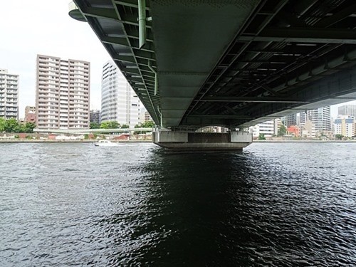 佃大橋の下をくぐり先に進むと隅田川を上流に向かって、水上警察のボートが疾走して行った。なにか事件か、事故か?