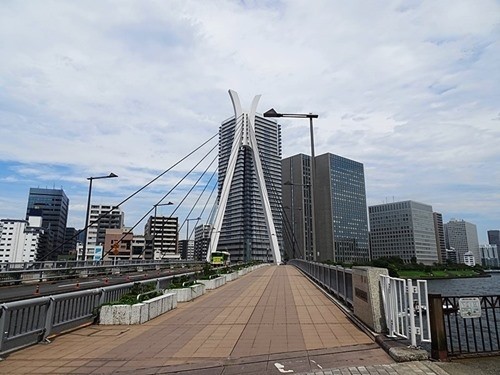 この道路は隅田川を渡って東京駅方面に向かうが、そこに架かる橋は美しい吊り橋で「中央大橋」という名前である。