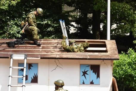 先ずはベニヤ作りの小屋から煙が上った。少年消防クラブのメンバーが、消火器で小屋を消火する。続いて警察と自衛隊が小屋に閉じ込められた人を救出する訓練である。