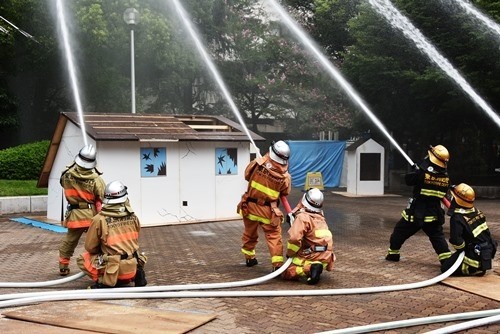 『ただいまから消防・警察・自衛隊の方々による、救出訓練を行います。その後、一斉放水を行います』