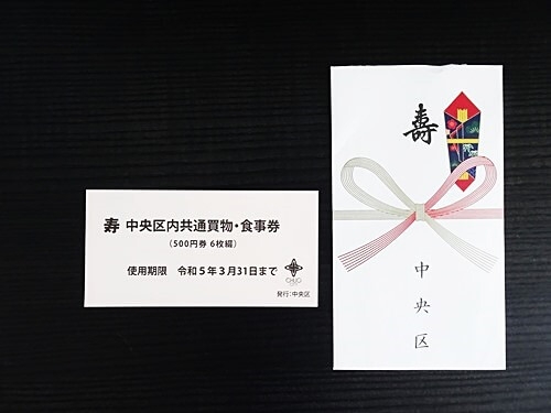 中央区では75歳以上に,毎年、敬老祝い金として3000円の「買物券」が支給される。