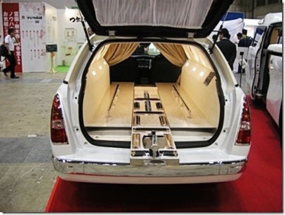 霊柩車の後部。霊柩車は儲かるのか、メーカーが4社も出ていた。