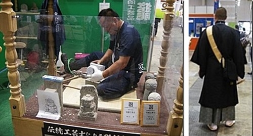 職人が石像を彫る実演をしていた。 会場には坊さんが多い。
